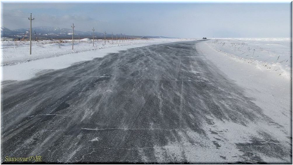 冬のロシアの街道の路面ではお馴染みの光景である。風の強弱や方向の変化によって路面の模様が絶えず変化していた。