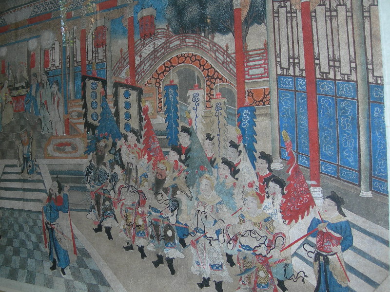 美術館の訪問は中国週間の時だった。館内に中国の絵や彫刻も並んでいた。 聞いてみたところ、ここの美術館には中国の絵画、彫刻、陶器、装飾品などが約1500ほど保管されているとの事。そこの中から選んだものが展示されていた。 16〜17世紀頃の作品(絹地、鉱物染料を含んだ糊絵の具) 作者:不詳 絵の横にあった露語の説明文には、「中国人は第一に天に感謝し、 それから先祖に感謝する。」と記されていた。 年賀に使われた絵(右上)とか、 三国志をテーマにしているような絵(右下)も並んでいた。 |